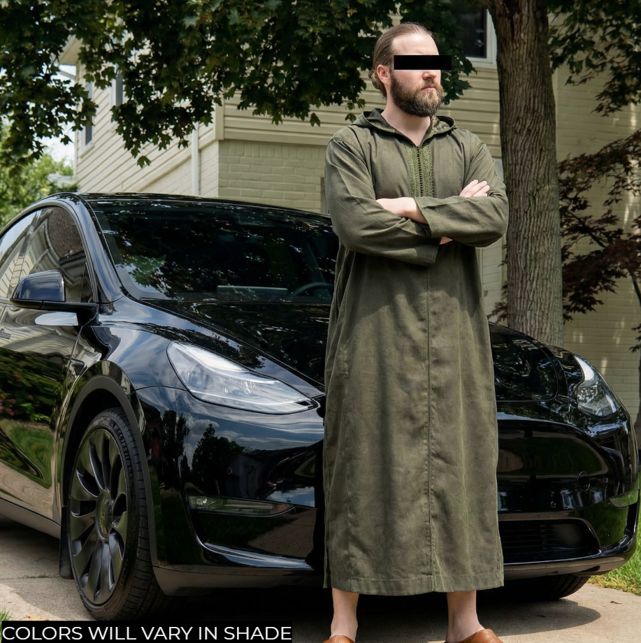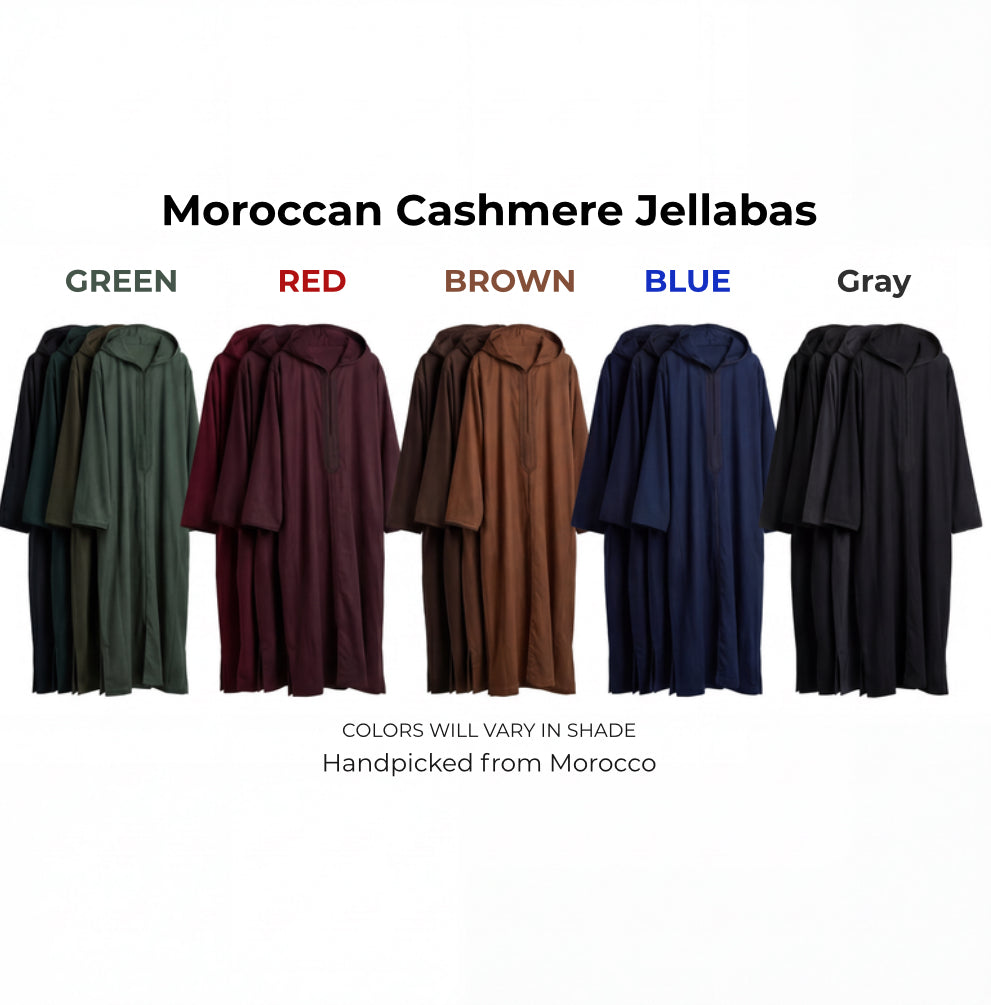 Wool–cashmere blend, with composition varying by maker. Each jellaba is hand-selected in person from independent sellers, resulting in natural variations in fiber ratios, texture, and feel. Some pieces may include small amounts of synthetic fibers for added durability and everyday wear.